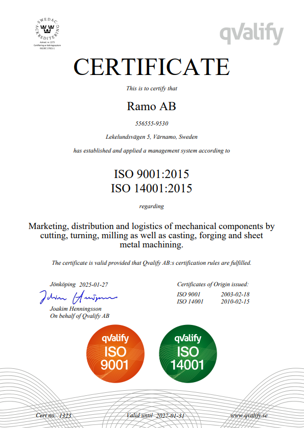 We start with the customer’s quality requirements and service level that becomes the established norm in force from contract review through the entire flow from production to final delivery. Quality control takes place against records already set at the factory, balances against the same document is in receipt of supplies at Ramos’s central warehouse in Värnamo. The documents filed at the Ramo for any post if they so wish. Ramo is responsible for the products available for shipment within 5 working days